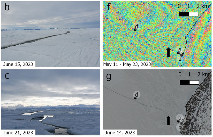Congratulations to PhD candidate Ada Loewen who just published a study in Canadian Journal of Remote Sensing that identified over 4000 fractures in the landfast sea ice of Admiralty Inlet. This paper describes a method that connects remotely sensed data (interferometric synthetic aperture radar (InSAR), optical imagery), Inuit Knowledge, and in-situ observations to identify fractures on the order of cm to m throughout the ice season (December–July) from 2018–2023.