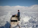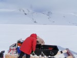 - Sierra Pope takes a break after drilling through sea ice near Petersen Bay (L.Copland)