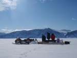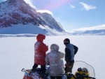 - Luke Copland, Derek Mueller and Sierra Pope get ready to core sea ice in Yelverton Inlet (L.Copland)
